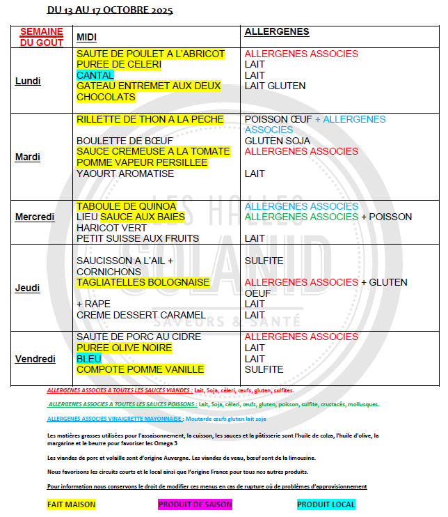 Menu du lundi 13 au vendredi 17 octobre 2025