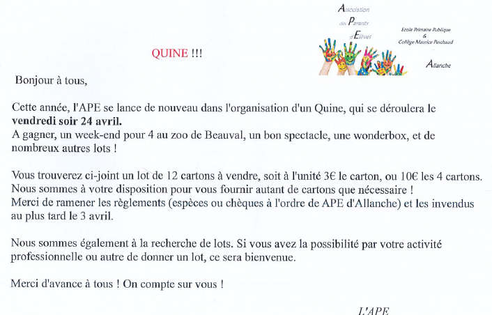 L'APE d'Allanche organise un quine le vendredi 24 avril au soir.