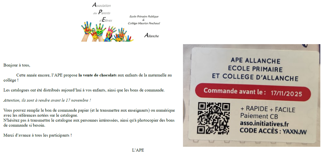 Participez à la vente de chocolats de Noël de l'APE de l'école et du collège d'Allanche, code d'accès YAXNJW.